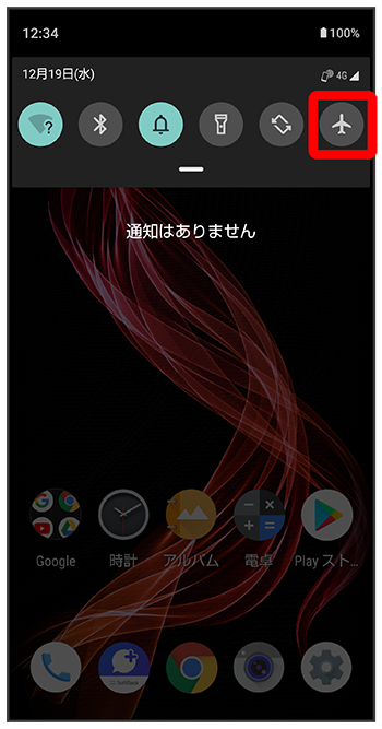 Wi-Fi機能やBluetooth®機能が有効のときに機内モードに設定すると、その時点でそれぞれの通信が無効になります。データ通信中に操作すると切断されますので、ご注意ください。