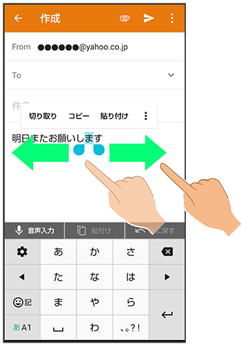 を左右にドラッグして、切り取り/コピーする文字を選択