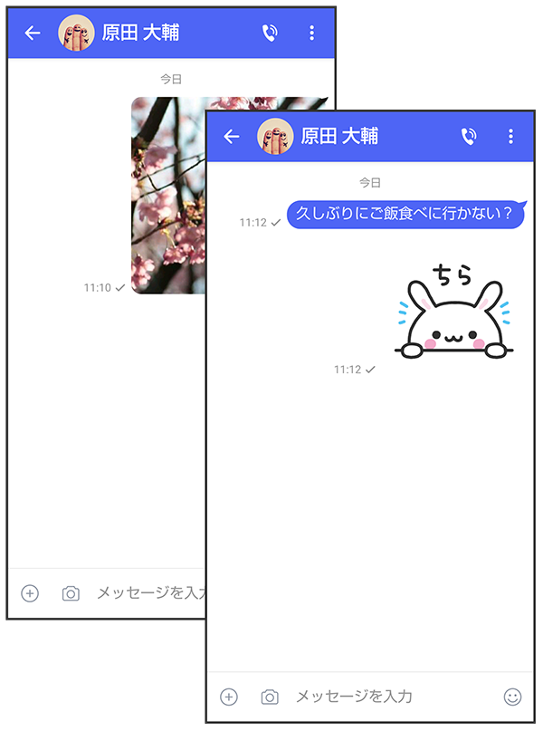 写真や動画はもちろん、スタンプや現在地の情報を送受信することもできます。