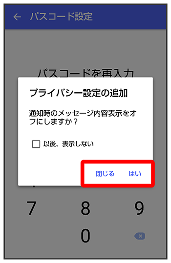 (+メッセージ)を開く際にパスコードの入力が必要になります。