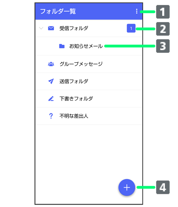 (+メッセージ)起動直後の画面はフォルダ一覧画面になります。フォルダ形式への切り替え方法について詳しくは、「フォルダ形式の表示に切り替える」を参照してください。