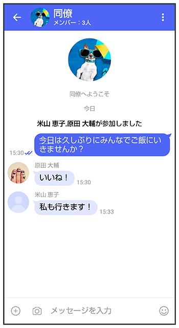 同じグループのメンバーに写真やスタンプなどが共有できます。