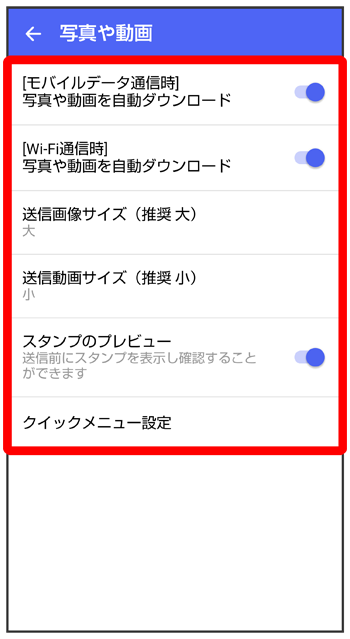 | [モバイルデータ通信時]写真や動画を自動ダウンロード | モバイルデータ通信時に受信した写真や動画を自動でダウンロードするかどうかを設定します。 |