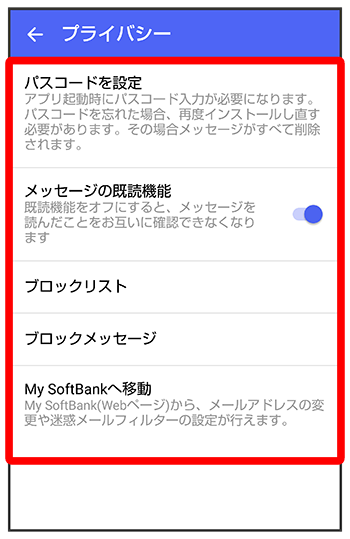 | My SoftBankへ移動 | My SoftBankへ移動し、メールアドレスの変更や迷惑メールフィルターの設定などができます。 |