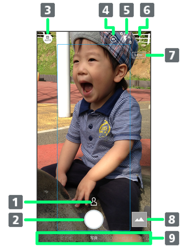 撮影時の各種設定を行います。詳しくは、「写真撮影の設定をする」、「動画撮影の設定をする」、「写真/動画撮影共通の設定をする」を参照してください。 - HDR表示2