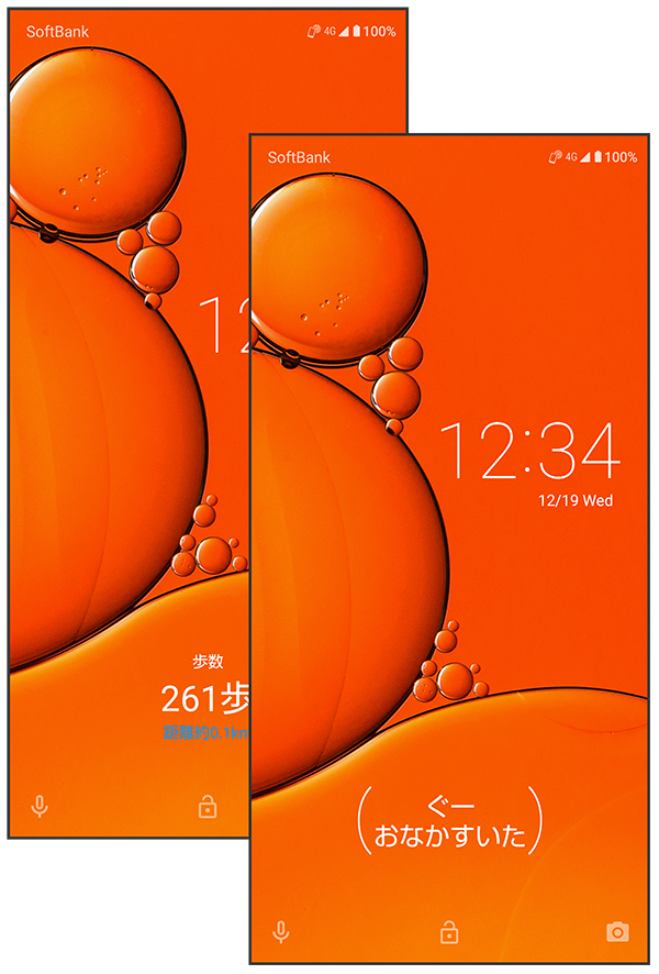 ロック画面では、エモパーがいろいろな情報をお知らせします。左右にフリックすると、情報を切り替えることができます。