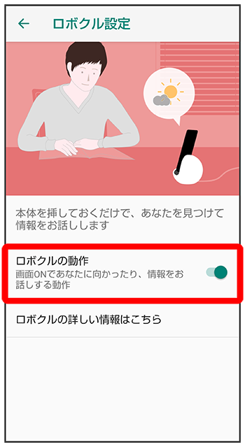 - 有効にすると、本機の電源が入っているとき、ロボクルで充電すると、ディスプレイ点灯時や充電開始、着信、アラームなどに連動してロボクルが回転します。