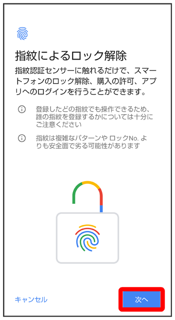 画面に従って画面ロック解除用のパターン/ロックNo.(PIN)/パスワードを設定