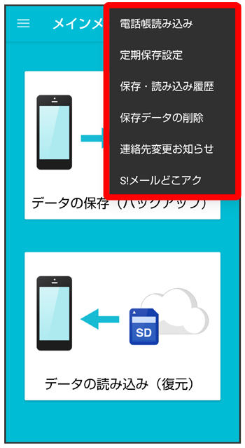 | S!メールどこアク1 | 本体の電話帳データを、「S!メール(MMS)どこでもアクセス」のサーバーにエクスポートします。 |