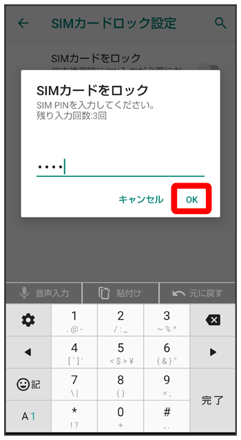 SIMカードロック設定中に、セキュリティと現在地情報画面でPINコードを入力(