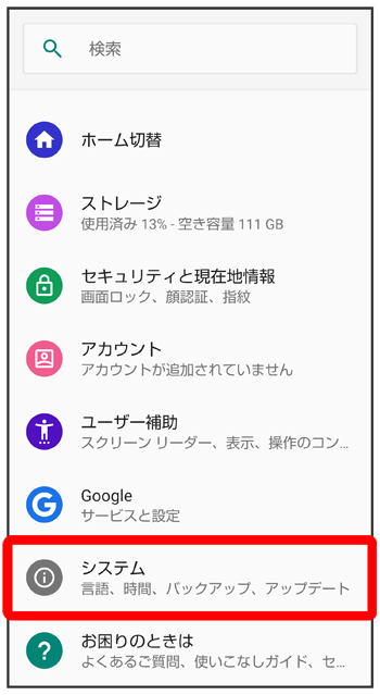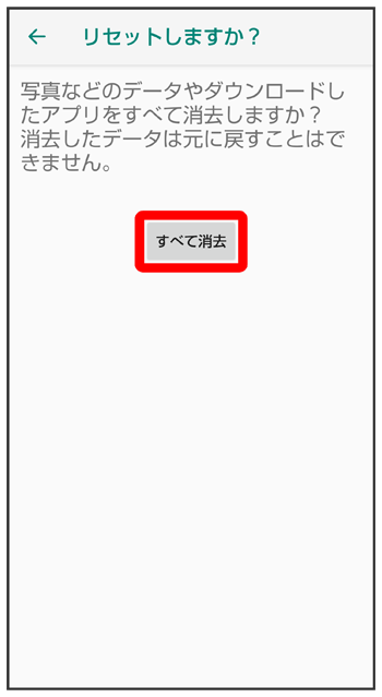 - すべてのデータを消去(出荷時リセット)を行うと、内部ストレージのデータがすべて消去されます。必要なデータは事前にバックアップをとることをおすすめします。