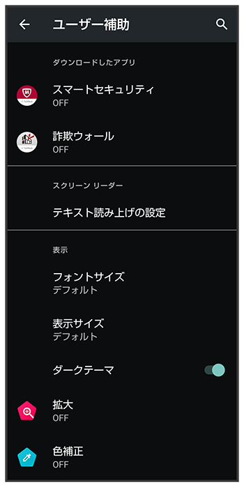 | 詳細設定 | が追加されます。拡大/色補正/色反転のショートカットでを選択した場合、ロック画面でも音量Upキー/音量Downキーを同時に数秒長押しして、拡大/色補正/色反転を使用するかどうかを設定できます。 |