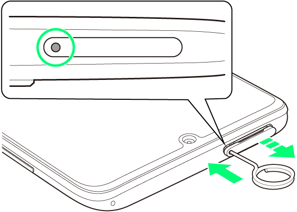 ディスプレイを上にして、カードトレイ取り出し用の穴に、SIM取り出しツールの先を差し込む