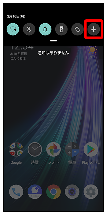 Wi-Fi機能やBluetooth®機能が有効のときに機内モードに設定すると、その時点でそれぞれの通信が無効になります。データ通信中に操作すると切断されますので、ご注意ください。