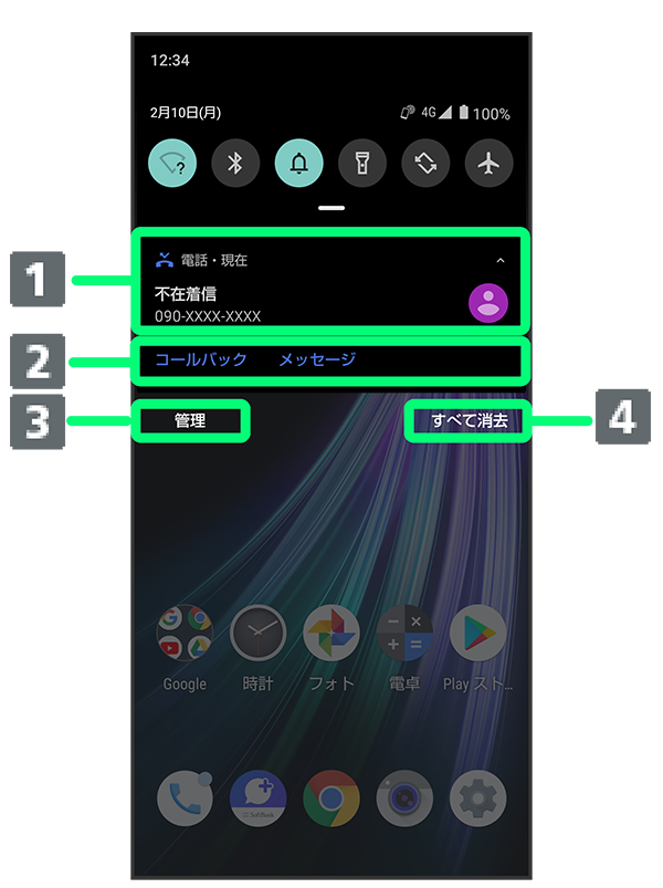 - 通知によって利用できる機能は異なります。たとえば着信の通知では、着信のあった電話番号に発信したり、SMSを送信できます。