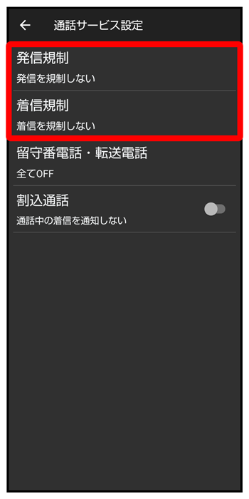 通話サービス設定画面で/規制方法をタップ発信規制をすべて解除する
