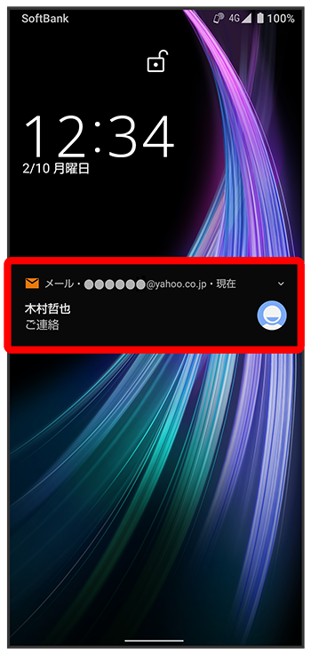 新着メールを受信すると、ロック画面に新着メッセージ通知が表示されます。