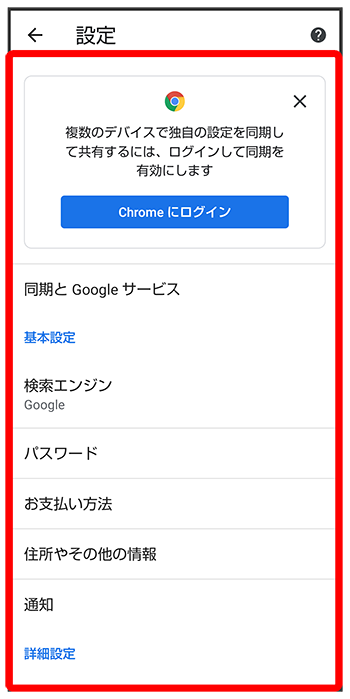 | 同期とGoogle サービス | Chromeと同期してほかの端末でChromeデータを確認したり、Googleのサービスを利用するかどうかを設定できます。 |