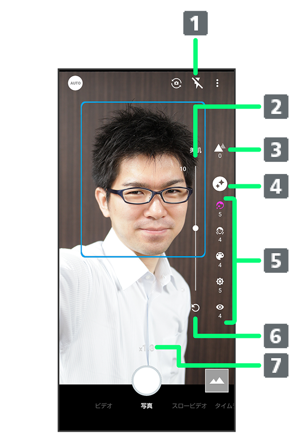 有効にすると、フラッシュの代わりに画面全体が発光し、夜の自撮りでも人物が明るく撮れます。 - 調節バー1