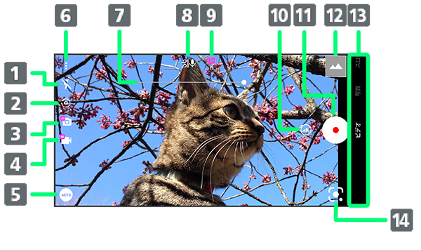 「フォト」の起動、または直前に撮った写真/動画が表示されます。 - 撮影モード