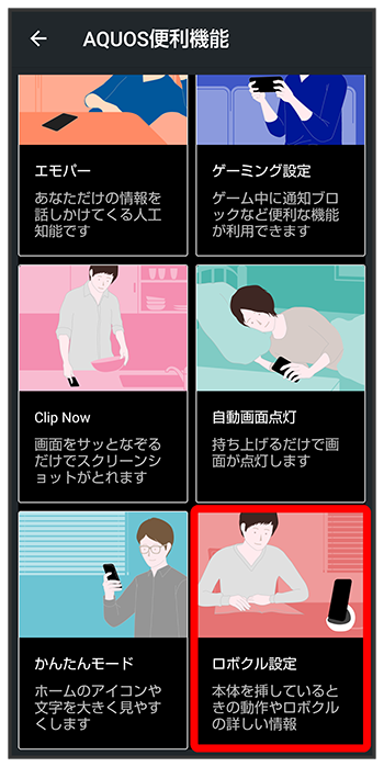 - 有効にすると、本機の電源が入っているとき、ロボクルで充電すると、ディスプレイ点灯時や充電開始、着信、アラームなどに連動してロボクルが回転します。