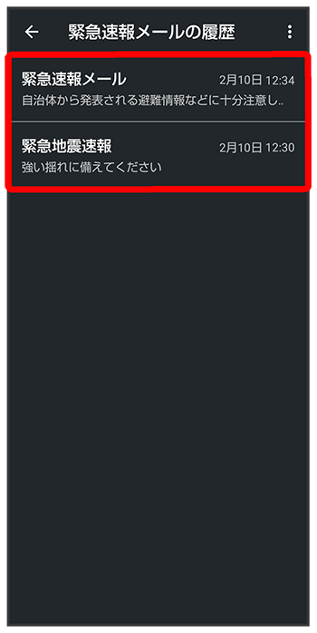 緊急速報メール受信メッセージ一覧画面が表示されます。