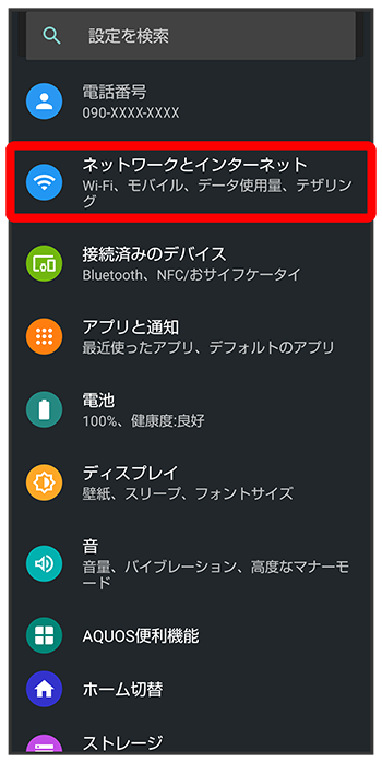 | Wi-Fiテザリング | Wi-Fi接続でテザリング機能を利用するかどうかや、Wi-Fiテザリングを利用する際のネットワーク名やセキュリティなどについて設定します。 |