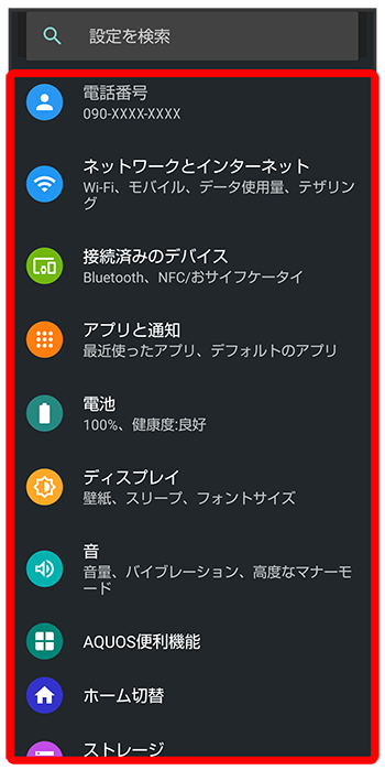 | ネットワークとインターネット | Wi-Fiやモバイルネットワーク、データ使用量など、ネットワークやインターネットに関する設定ができます。 |