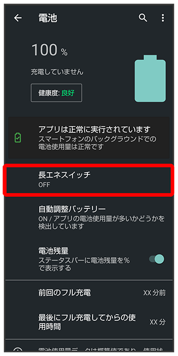 電池残量が90%になったときに長エネスイッチを自動的に無効にするかどうかを設定する