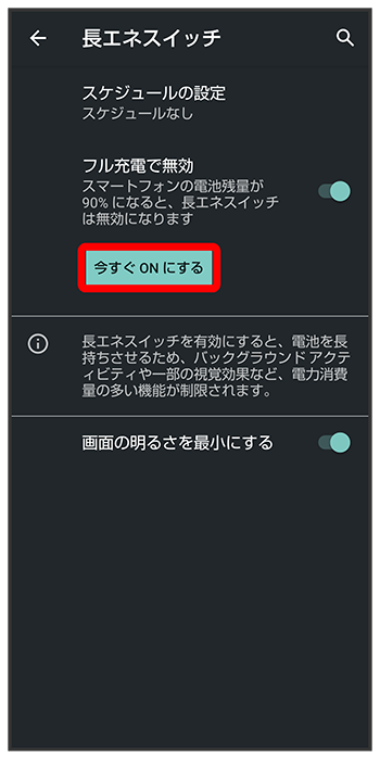 長エネスイッチ画面で/- を選択したときは、バーをドラッグして長エネスイッチを自動的に有効にする電池残量を調節できます。