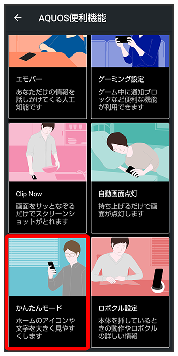 かんたんモード画面でホーム画面や文字の大きさなどを個別に設定する