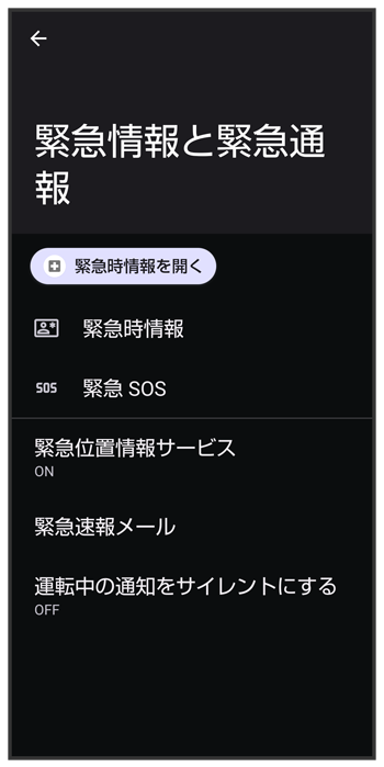 | 緊急 SOS | ・緊急 SOS の使用 電源キーをすばやく5回押して緊急 SOS画面を表示させるかどうかを設定します。 ・カウントダウン アラームを鳴らす 緊急 SOSするときにカウントダウンの大きな音を鳴らすかどうかを設定します。 ・緊急通報 緊急通報用の電話番号を設定します。 |