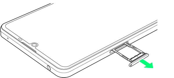 - ディスプレイを上にして、カードトレイを引き出してください。ディスプレイを下にしたり、本機を立てた状態でカードトレイを引き出すと、SIMカードやSDカードがカードトレイから外れ、紛失する可能性があります。
