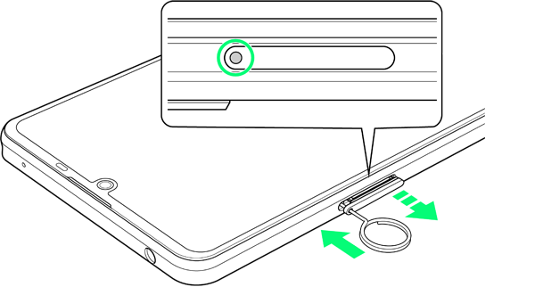 ディスプレイを上にして、カードトレイ取り出し用の穴に、SIM取り出しツールの先を差し込む
