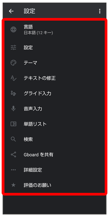 Gboardに関する動作を設定できます。設定できる項目は次のとおりです。