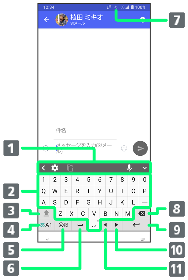 - 絵文字/記号/顔文字を入力(ロングタッチすると、入力拡張プラグインを表示。文字入力中は、カタカナ/英字変換3)