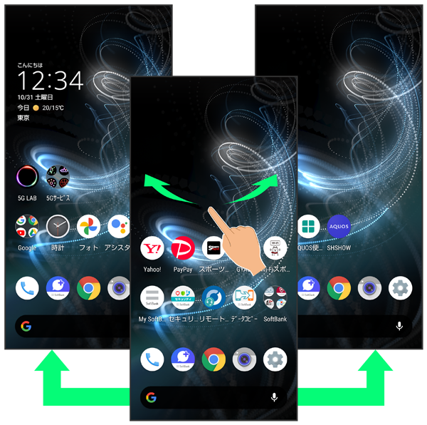 各シートを左右にフリックすると、ホーム画面シートを切り替えることができます。