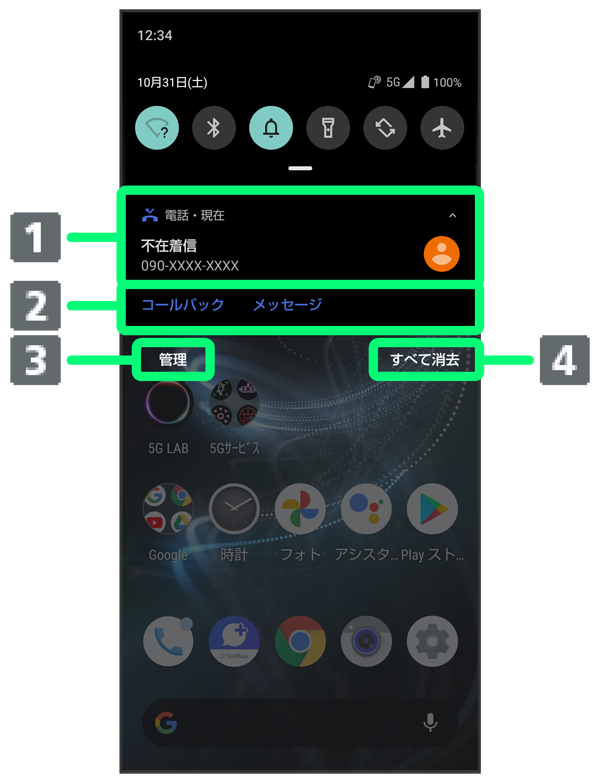 - 通知によって利用できる機能は異なります。たとえば着信の通知では、着信のあった電話番号に発信したり、SMSを送信できます。