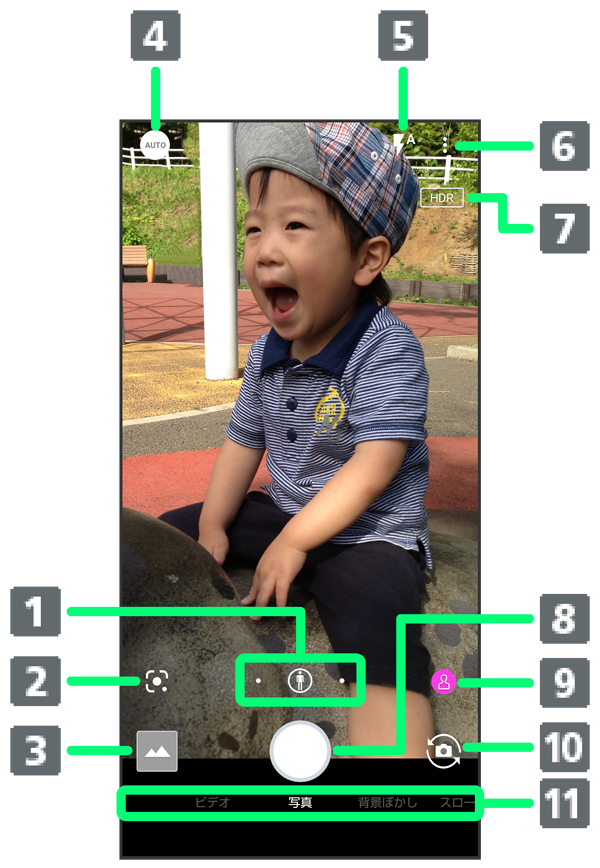 撮影時の各種設定を行います。詳しくは、「写真撮影の設定をする」、「写真/動画撮影共通の設定をする」を参照してください。 - HDR表示2