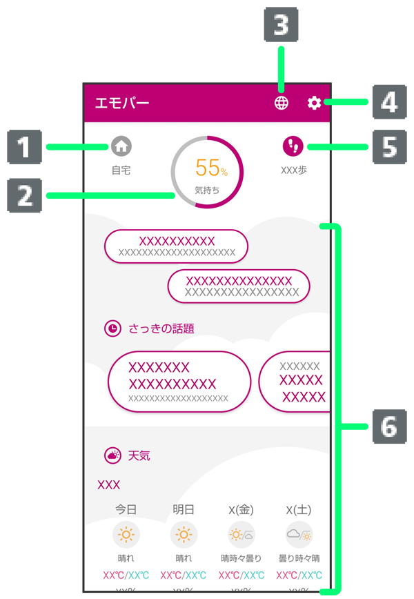 エモパー画面では、エモパーとあなたとのコミュニケーション度合いを確認したり、情報の登録や設定を行ったりすることができます。