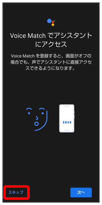 - Voice Matchを使うと、アシスタントキーを押す代わりに、画面点灯時に本機に「OK Google」と話しかけることで、音声操作が利用できます。Voice Matchを使いたい場合は、をタップしたあと、画面に従って操作してください。