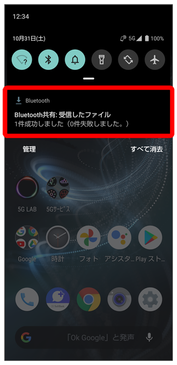 が表示されます。ステータスバーを下にフリックしてBluetooth®共有通知をタップしてください。