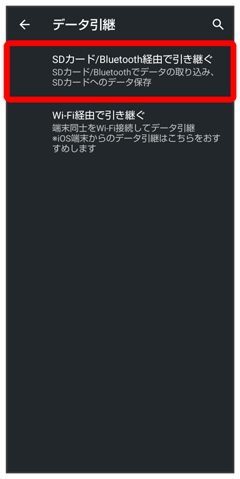- iPhone端末からデータを引き継ぐ場合は、をタップしてください。以降は画面に従って操作してください。