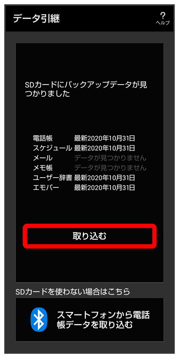 ほかの機器や本機でSDカードに保存したデータ(電話帳、スケジュール、ユーザー辞書/学習辞書(S-Shoin)、エモパー)を、本機に取り込むことができます。