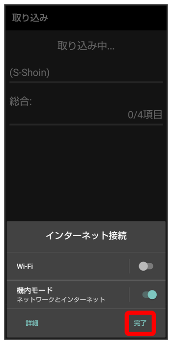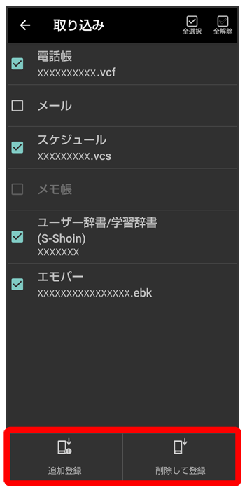 ユーザー辞書/学習辞書(S-Shoin)を取り込む場合、内部ストレージに保存されているユーザー辞書/学習辞書(S-Shoin)のデータが削除されますのでご注意ください。