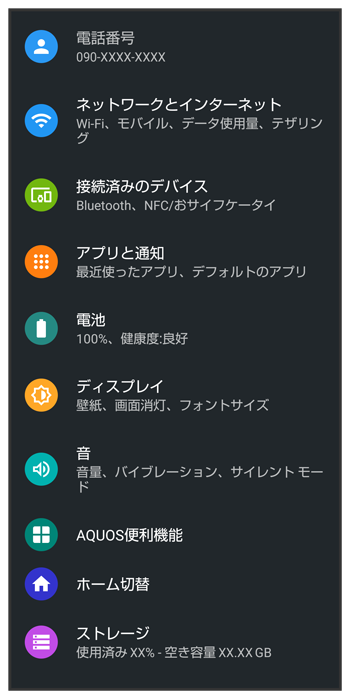 | 電池 | 電池の利用状況を確認したり、電池の消費を軽減する設定などができます。 |