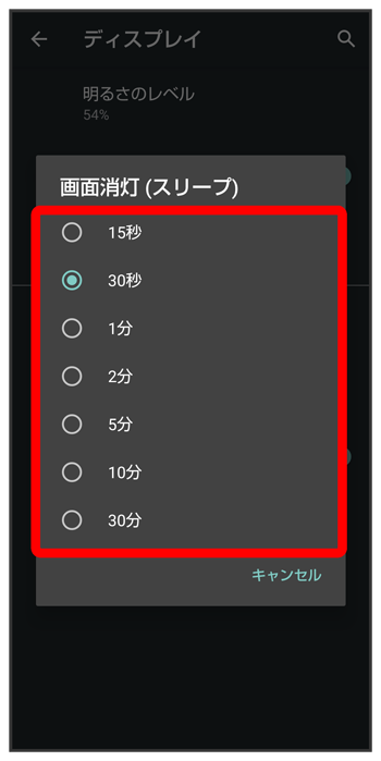 ディスプレイ消灯までの時間が設定されます。