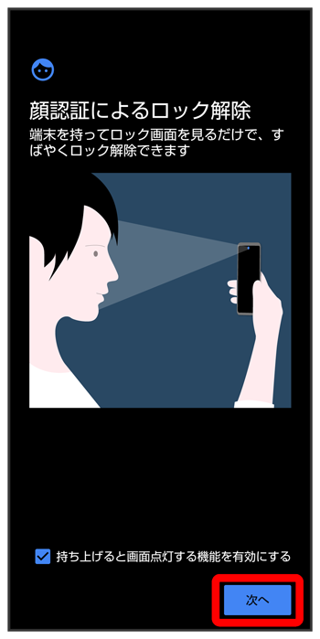 顔データを登録すると、画面点灯時に自動的に顔認証され、ロックが解除されます。
