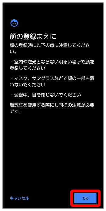 ホーム画面で顔データの登録後に顔認証の概要や注意事項を確認する