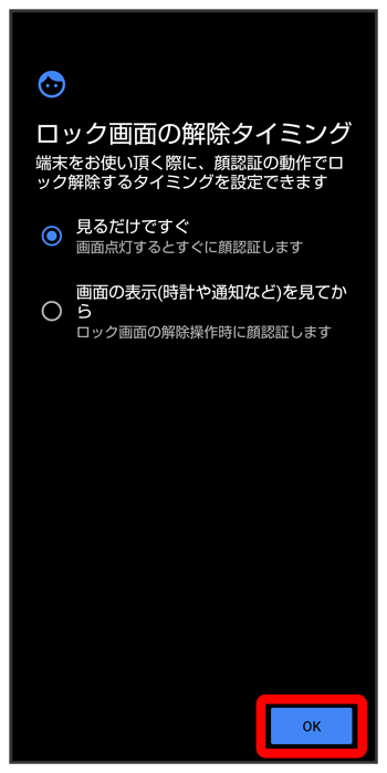 ホーム画面で顔データの登録後に画面ロックを解除するタイミングを変更する